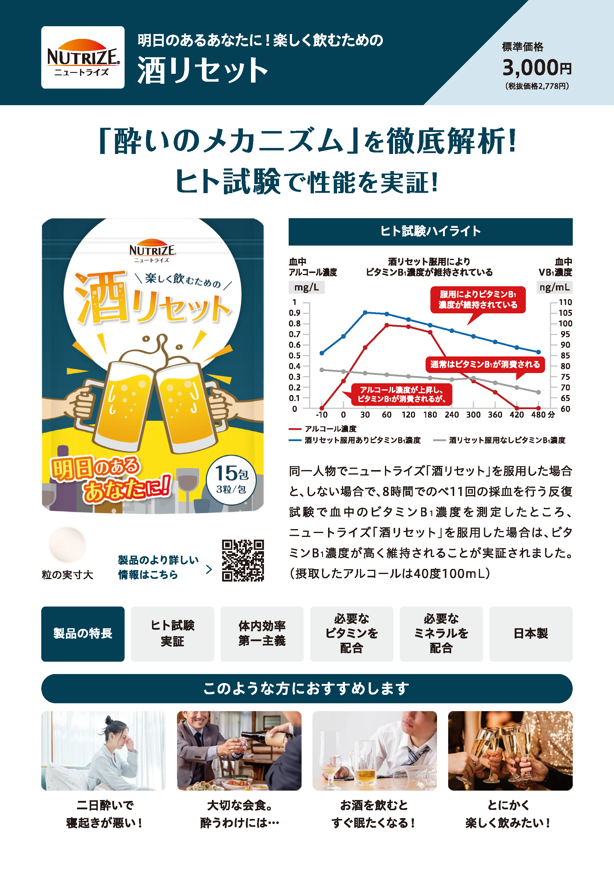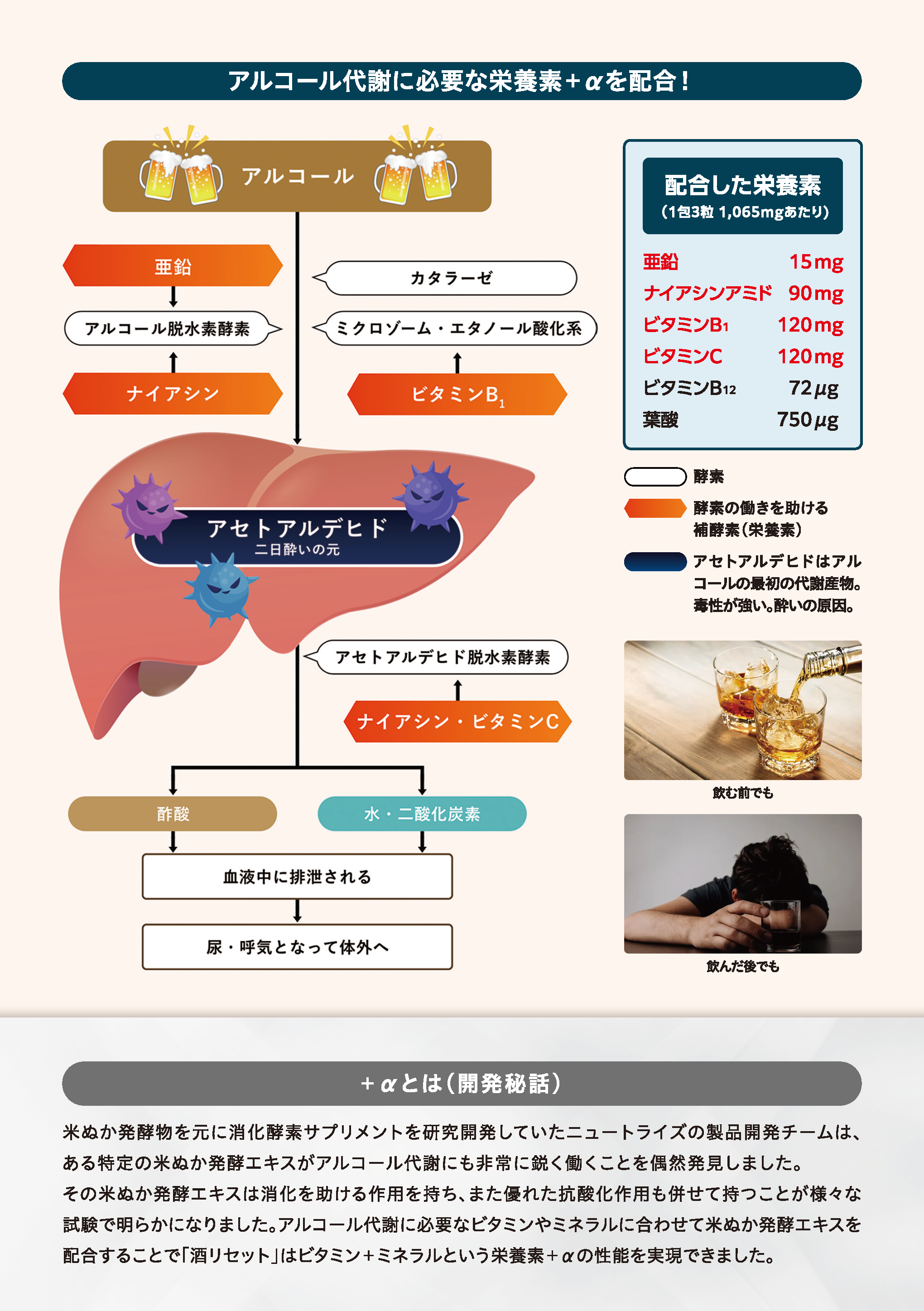 私たちニュートライズは、アルコール代謝メカニズムを徹底解析し、アルコール代謝に必要な酵素が正常に働くための補酵素(ビタミンB1、ナイアシン)やミネラル(亜鉛)を中心に配合、設計しました。